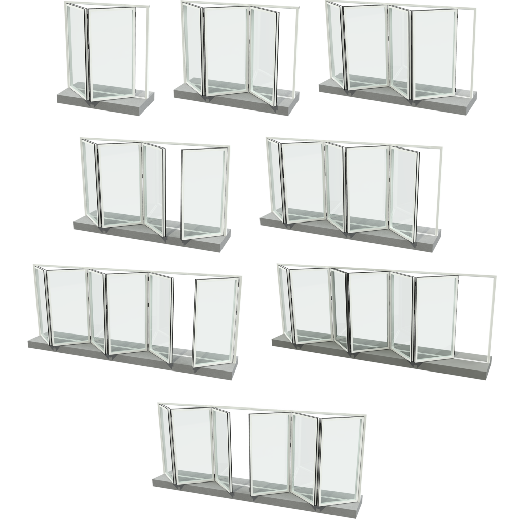 Our bi-fold windows can be configured to fit various opening sizes, ranging from compact two-panel designs to expansive seven-panel systems that open in both directions. Here are some examples of our numbering system for panel configurations: